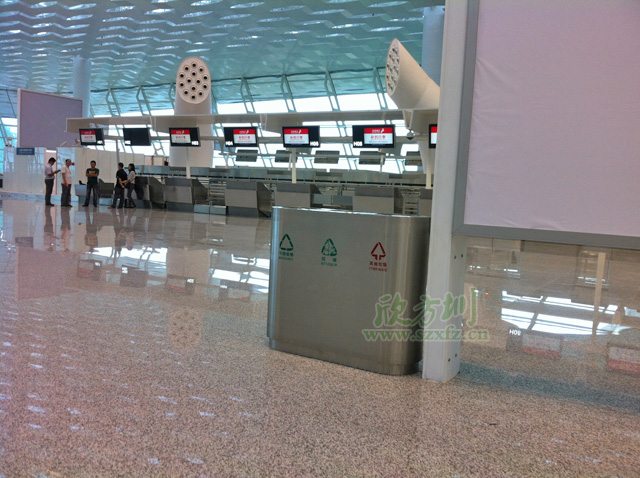 為了裝飾寶安國際機場T3航站樓和GTC大樓的環境衛生,深圳市機場股份有限公司于2013年4月在我公司訂購了2733個垃圾桶,包括有大型不銹鋼垃圾桶、自棄桶、阻燃桶和接水桶等多種材質的垃圾桶。