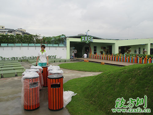 深圳天空農莊是中國首家以有機農業為主題的兒童體驗樂園,以“給孩子一個綠色的童年”為核心,以有機農業為依托,以體驗式教育理論為基礎,專為3-15歲兒童打造的多功能主題樂園!天空農莊采購部為利于環保,提升環境形象,創建和諧的自然環境,特意聯系我司欣方圳訂購了一批鋼木垃圾桶