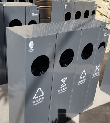 采用足厚優質鋅板烤漆工藝制作而成,經酸洗磷化除油防銹處理,室內耐用升級。可做可回收物、其他垃圾、有害垃圾、廚余垃圾4分類垃圾收集使用。