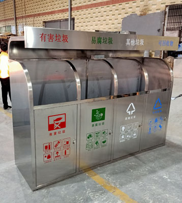 小區(qū)垃圾分類站點四類垃圾分類垃圾桶,不銹鋼無疑是較為理想的材質(zhì)。它戶外防銹蝕效果好,表面金屬光澤高檔美觀,污漬也易清理。不銹鋼分類桶產(chǎn)...