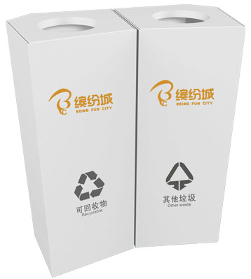 不銹鋼經激光切割數控折彎焊接成型,表面高溫噴塑工藝,塑粉附著力強,可大大延緩銹蝕時間,使2分類組合垃圾箱在商場室內環境使用更耐用。