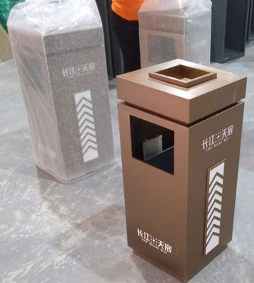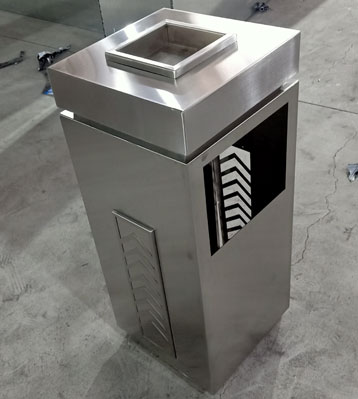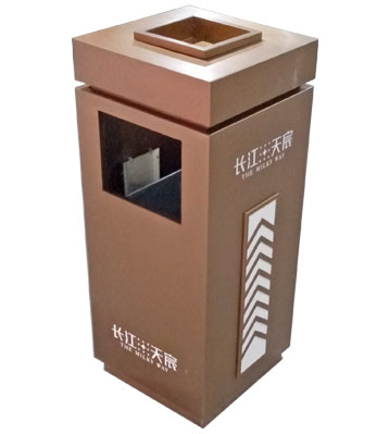 方形單桶設計用于樓盤瓜果紙屑作為果皮箱使用,兩面開口作為果皮垃圾投口,另兩面桶身上做裝飾效果,不銹鋼方形電鍍垃圾桶四面絲印樓盤LOGO。桶頭打開可取內桶收運垃圾,頂部嵌入煙灰盅放小石子滅煙和煙蒂收集使用,表面做電鍍效果高檔美觀!