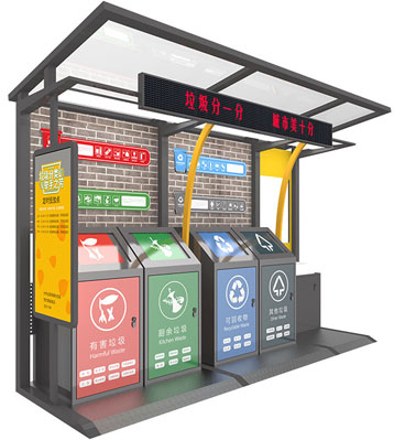 設(shè)有擋雨棚,可配備垃圾箱信息顯示屏、防水照明燈、廣告屏,進(jìn)行地面硬化。對社區(qū)玻金塑紙可回收物,其他垃圾,廚余垃圾,有害垃圾等生活垃圾定時(shí)定點(diǎn)投放收集.