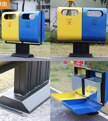 黃色用于不可回收垃圾收集、藍色用于可回收垃圾收集使用,配置鍍鋅內桶,投口上提式打開可輕松取出內桶收運垃圾,底座預留孔位打膨脹螺絲與地面固定,可長期擺放戶外用于2分類垃圾收集使用,穩固耐用!